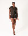 Lace-trimmed brown shorts with a wrap front — feminine details meet relaxed sophistication.