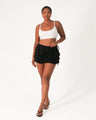 • Fitted shorts with tiered ruffle details